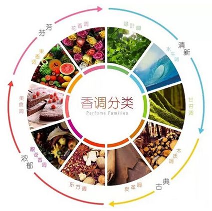 柑橘调:包括柑橘、酸橙、柠檬等香型,有清新和清洁的感觉;花香调:包括单独一种花的香味和混合花香,有高雅和柔和的风格;馥奇调:馥奇香料给人一种绿色的蕨类的印象,让人联想到松树林;木质香:以檀香、柏木香、沉香、杉木为代表,有厚重感;柑橘类:主要出现在白葡萄酒中,比如莎当妮、长相思;水果:红色水果、黑色水果、热带水果,都是葡萄酒的一类香气;花香:如玫瑰、紫罗兰、椴花,红、白葡萄酒中都可能出现;植物:青草、树叶、青椒香气,还有在老酒中容易出现的植被、森林类香气;木质香气:松木、杉木、烘烤类香气,出现在橡木桶陈酿的酒中;