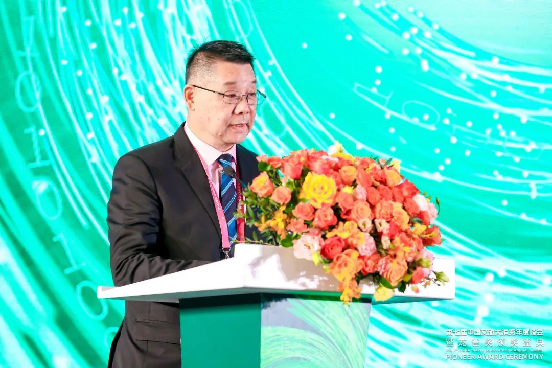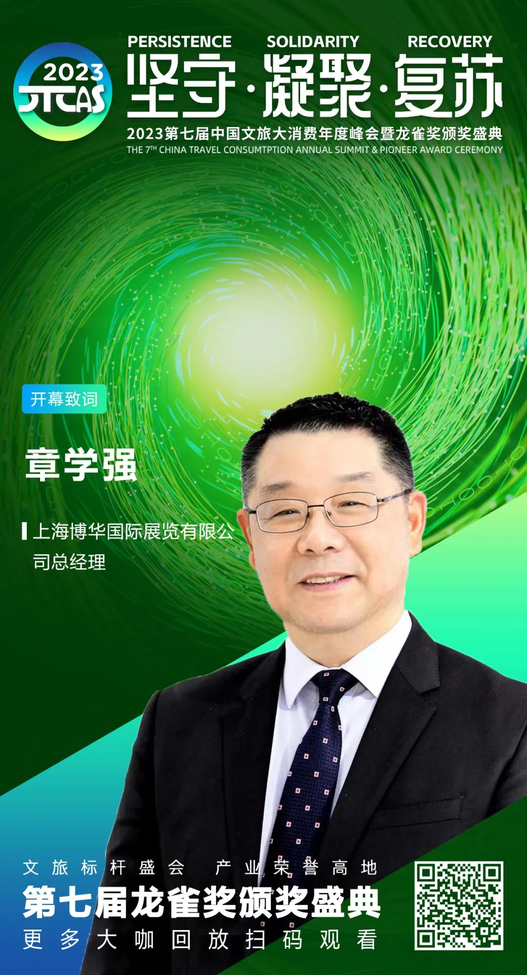 非常荣幸在第七届中国文旅大消费年度峰会暨龙雀奖颁奖盛典与各位见面, 并代表上海博华国际展览有限公司作为上海旅游产业博览会和本次峰会的联合主办方,诚挚的欢迎各位嘉宾的到来!在此, 我要特别感谢我们的合作方执惠集团,与我们共同搭建为文旅大消费产业赋能的大平台,打造全球规模领先、全供应链,高质量和高水平的产业盛会。