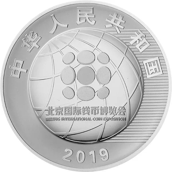 2019北京国际钱币博览会银质纪念币是新一轮十枚博览会纪念币的第三枚,正面主体图案延续了上一年的设计方案,采用北京国际钱币博览会标志,衬以地球图形及象征币齿的线条等组合设计,并刊国名、年号。画面整体设计寓意北京钱币博览会的国际化,体现了国际钱币文化交流的主题。