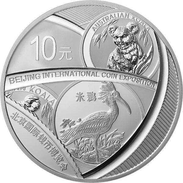 2019北京国际钱币博览会银质纪念币背面图案为中国珍稀动物朱鹮银币与澳大利亚考拉银币图案,结合钱币图形元素组合设计,并刊“北京国际钱币博览会”中、英文字样及面额。