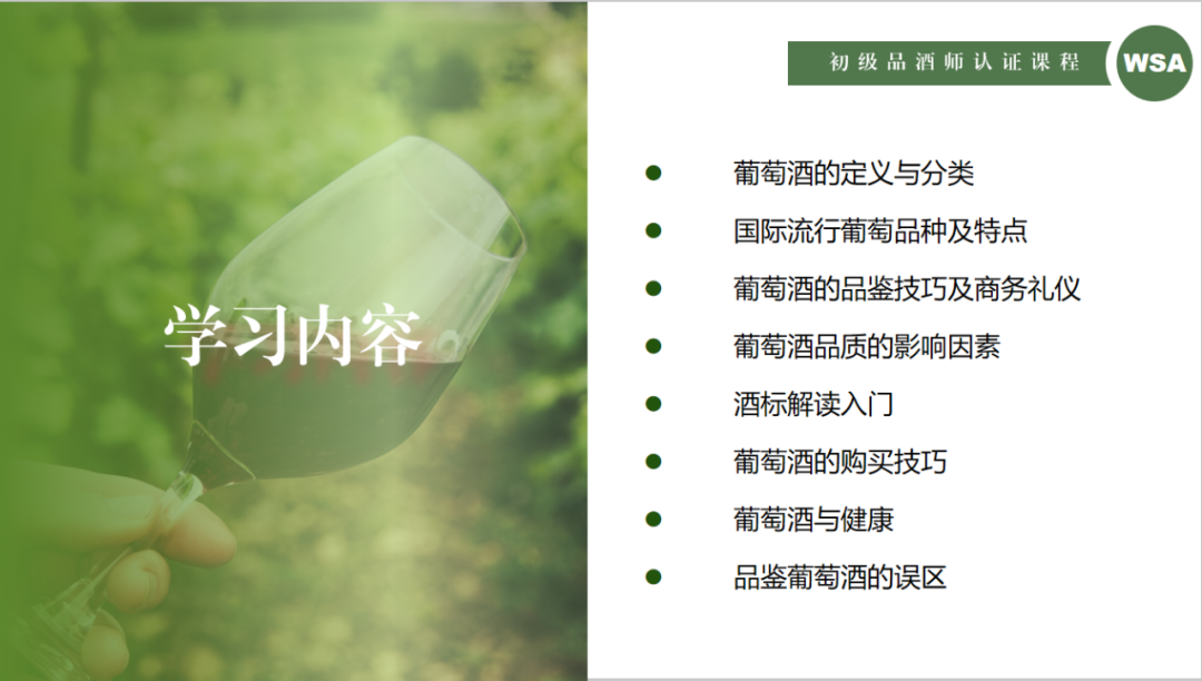 葡萄酒与烈酒品酒师认证课程Wine and Spirit Academy (WSA),是针对葡萄酒与烈酒从业人员及爱好者的专业课程,课程所有内容全部由国内外知名葡萄酒专家研发而成,并首次引进了国外的教学体系,针对中国葡萄酒市场及消费者和从业者的实际需求,全面化、实用化、技能化、专业化、趣味化的设计教学内容。