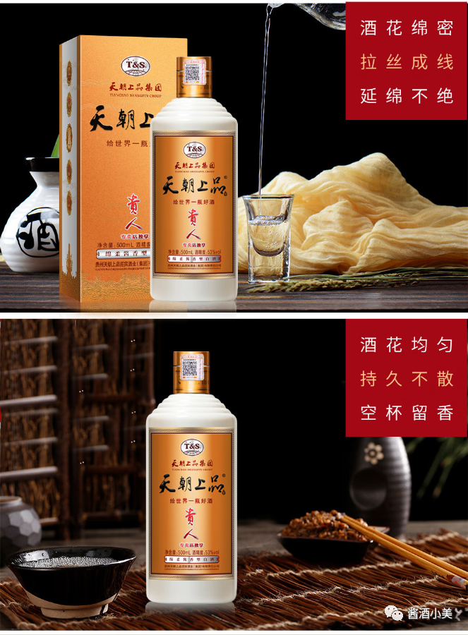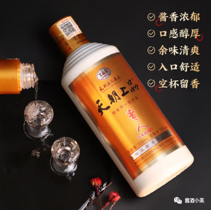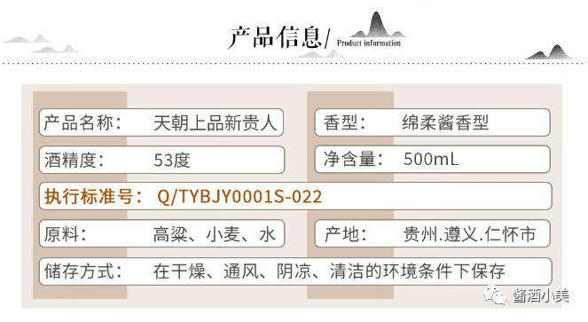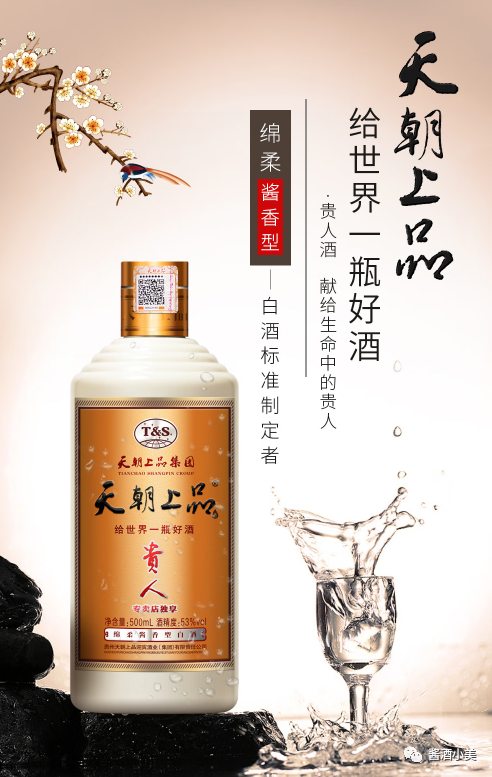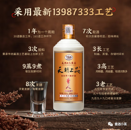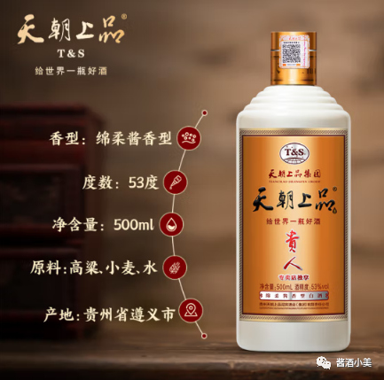 茅台集团天朝上品贵人酒,是一款特的柔和酱香型白酒。柔和酱香型白酒既秉承了师法自然的酱香型酒多次蒸煮、多次发酵、多次取酒、长期窖藏的传统酿造工艺,又利用赤水河流域500-600米海拔特有的微生物群落,融合现代微生物技术,增加了续沙投料的创新工艺,创新研制出柔和淡雅口感酱香型白酒。