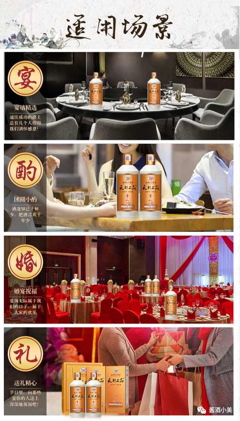 天朝上品贵人酒包装设计相当的高贵大气,站在礼品酒的立场,不落俗套;站在婚宴酒的角度,喜气十足,典雅大方;朋友聚会小酌,含情脉脉;当然,家宴聚会、公司聚会、娃娃满月、老人高寿、孩子升学宴、谢师宴等这些场景,桌子上摆上天朝上品贵人酒,可以说都还是比较合适。