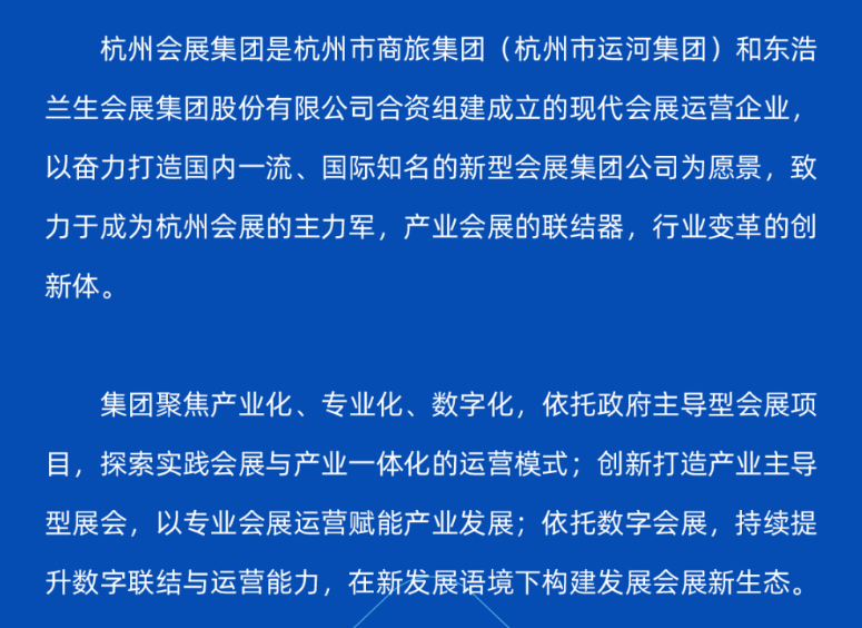 杭州会展业发展近年来可谓异军突起。G20的成功举办让杭州展览业的发展比以往更趋优势,和一直来排名全国第三的杭州会议产业一起,这些年也算在国内会展业中形成了特有的声势,产生了相对耀眼的影响力。在稳步推进的良好氛围中,第19届亚洲运动会的举办将使得杭州这座城市更加炙手可热,因而杭州正在再次被推向2023年中国会展业发展的最前沿,也必将在2023年会展业发展中留下浓墨重彩的一笔。杭州西湖,一直是那么休闲而婉约,始终更多是以淡妆的形式出现,或许在2023年,杭州的重彩成份将会更多。毕竟,历史与时代给予了杭州更多的使命与重任。此时的杭州,天时地利人和,交通、旅游等城市面貌大为更观,正在翘首等待世界人民的检阅,期待更多的各国优秀运动员和嘉宾们前来杭州一展风采。杭州会展业的发展相对具有优势,也为杭州会展集团的发展带来了全新的契机。终究,一个城市的经济发展,需要有一大批优秀企业持续引领,奋勇前行。同样地,在会展产业发展中,也十分需要杭州会展集团等优秀企业更好地创建优势平台,带领更多企业一同前进。组建会展集团,是近年来中国会展业发展的一大趋势。在这样的发展态势下,杭州会展业积极作为,在较早的时候就组建具有一定“航母”效应的杭州会展集团,至今已经开始逐步呈现发展优势,在众多大型展会活动中崭露头角。这符合杭州会展业规划的初衷,其发展进展也符合杭州会展业发展的预期。杭州国际博览中心的二期建设与杭州大会展中心的积极建设,将为杭州市会展业发展带来更多的机遇,也将赋予杭州会展集团更多的重任。
