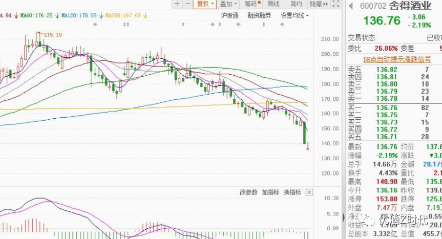 据来自第一财经消息,6月5日开盘以后白酒板块股价就集体下行,舍得酒业(600702.SH)首当其冲在上午10点42分触及跌停,根据当日收盘后数据显示,舍得酒业下跌10%,古井贡酒下跌4.62%,酒鬼酒等跌幅超过3%。