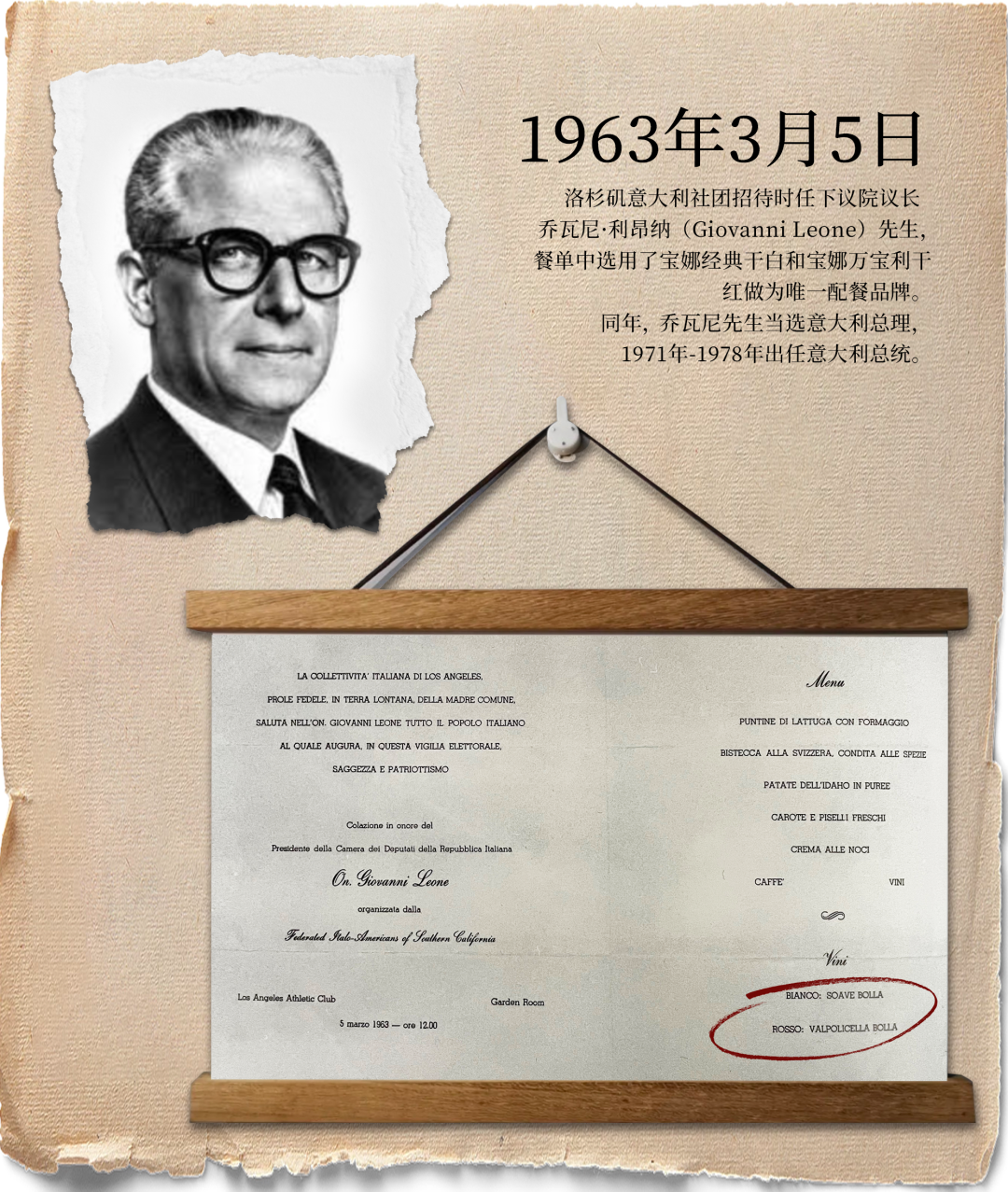 1963年3月5日,洛杉矶意大利社团招待时任下议院议长乔瓦尼·利昂纳(Giovanni Leone)先生,餐单中选用了宝娜经典干白葡萄酒和宝娜万宝利干红葡萄酒作为唯一配餐品牌。同年乔瓦尼先生当选意大利总理,1971年-1978年出任意大利总统。