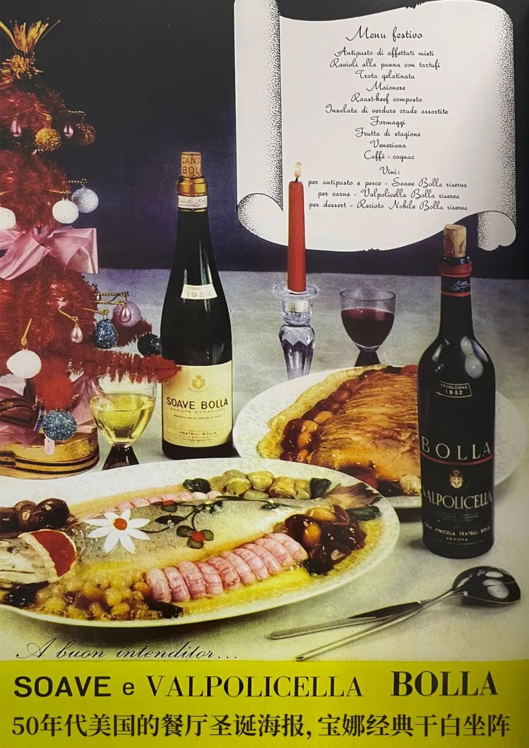 自50年代开始,美国餐厅的圣诞海报都会使用宝娜经典干白葡萄酒作为主打配餐用酒。