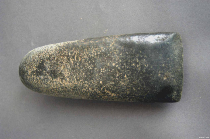 原镇原县三岔公社征集,长16厘米,宽6.3厘米,厚3.5厘米。石质,整体呈长方体,背端为椭圆形,背窄刃宽,双面刃,有使用痕迹。属于国家三级文物,现收藏于庆阳市博物馆。