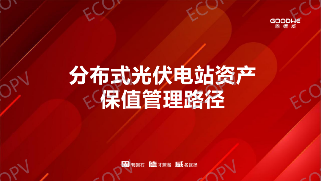 2023年6月5日,由商务部投资促进事务局指导,中共泰州市海陵区委员会、泰州市海陵区人民政府主办,江苏(泰州)新能源产业园区、中国绿色供应链联盟光伏专业委员会、泰州海能新能源集团有限公司承办的2023中国海陵光伏产业发展论坛在江苏泰州顺利举办。本届论坛大咖云集,其中光伏科技前沿研究学者、行业协会、第三方机构等的众多嘉宾莅临会议现场,纷纷发表行业风向标观点。在征求嘉宾意见后,现将部分主题报告演讲嘉宾PPT分享给大家:本篇分享固德威技术股份有限公司智慧能源解决方案专家章刘磊《分布式光伏电站资产保值管理路径》。请关注中国绿色供应链联盟光伏专委会官方微信,随时随地获取最新讯息