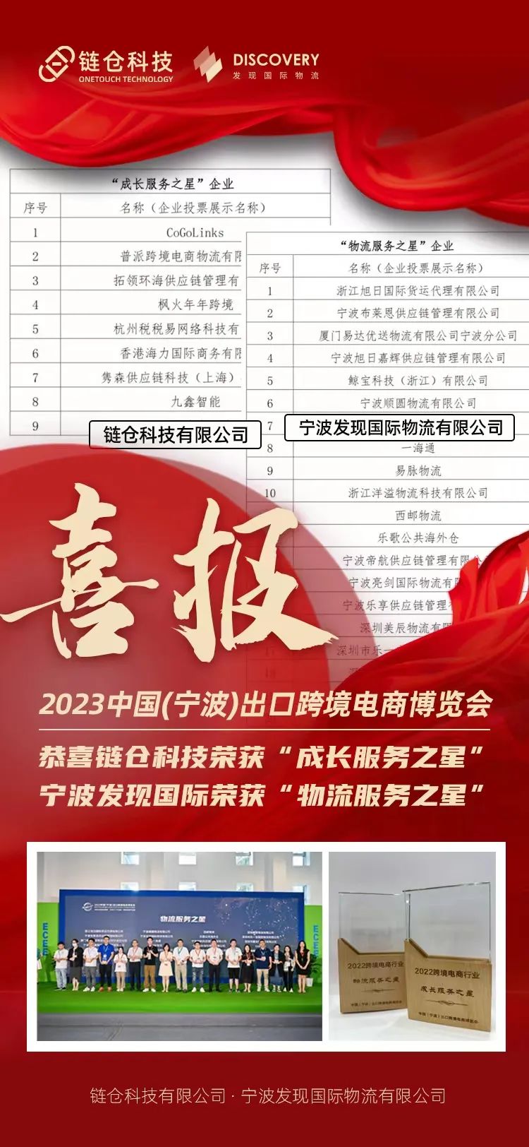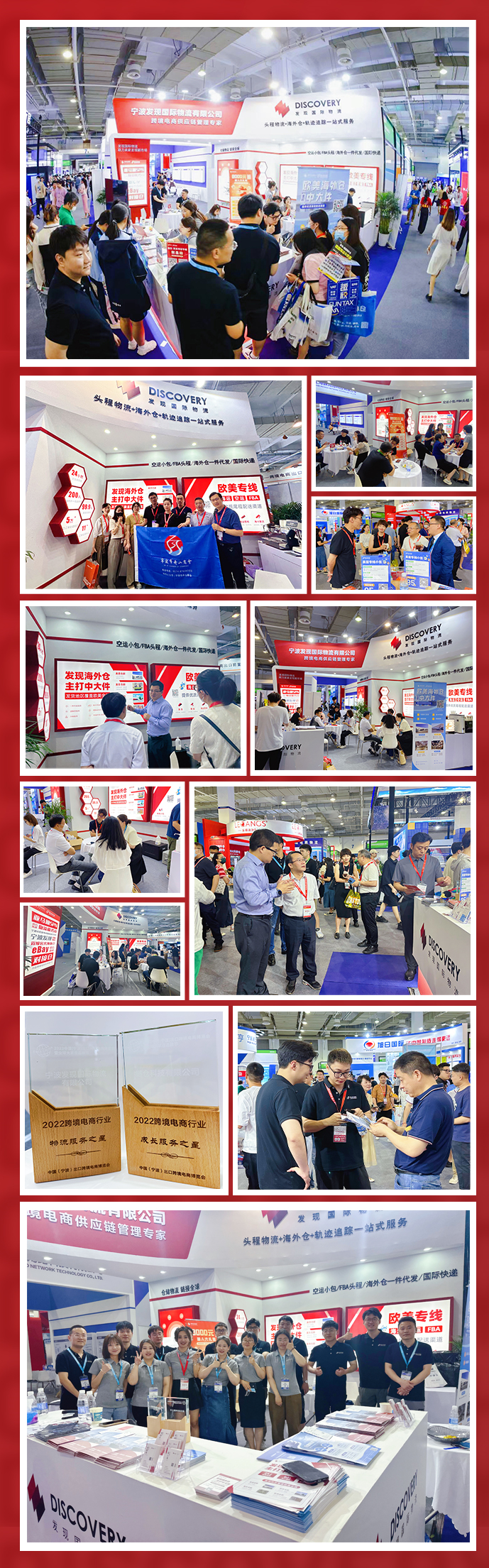 5月31日-6月2日,2023中国(宁波)出口跨境电商博览会在宁波国际会展中心成功举办,八大品类展馆,展示面积70000平米,汇聚2000+外贸工厂,超80项同期活动。作为背靠世界第一大港的行业大展,宁波跨博会成为跨境人关注的行业风向标,3天的展会展馆内人流络绎不绝,共计近7万跨境人到场精准对接商机,把握生意突破的关键机遇。宁波发现国际物流作为众多Top sellers的首选服务商,致力于为跨境卖家提供“头程物流+欧美海外仓+轨迹追踪”一站式服务。与各位新老朋友在本次跨博会7号馆H7-521展位面基。在本次展会中更是收获满满,展位人流络绎不绝。众多卖家前来咨询产品,发现小伙伴们现场为众多跨境电商企业提供了专业物流解决方案,更为大家准备了精美礼品。由我们举办的“供应链专场”线下峰会也在此次中国(宁波)出口跨境电商博览会7号馆论坛区,大会邀请了华北、华东亿级卖家,有经验丰富的操盘手讲师,从断货危机、广告运营、SaaS、ChatGPT、冲击BSR榜单等多维度分享,助力卖家乘风破浪,赢在出海!链仓科技总裁许光辉作为此次大会特邀演讲嘉宾,为到场卖家分享“SaaS服务如何优化供应链",助力卖家持续优化供应链,降低物流成本。发现物流荣获2022跨境电商行业“物流服务之星”大奖、链仓科技荣获“成长服务之星”大奖。衷心感谢广大的客户以及跨境朋友们对发现物流&链仓科技的信任以及支持。2023中国(宁波)出口跨境电商博览会圆满结束!发现物流不忘初心致力于为卖家带来更优质的服务,助力中国品牌出海。我们,下届见!!