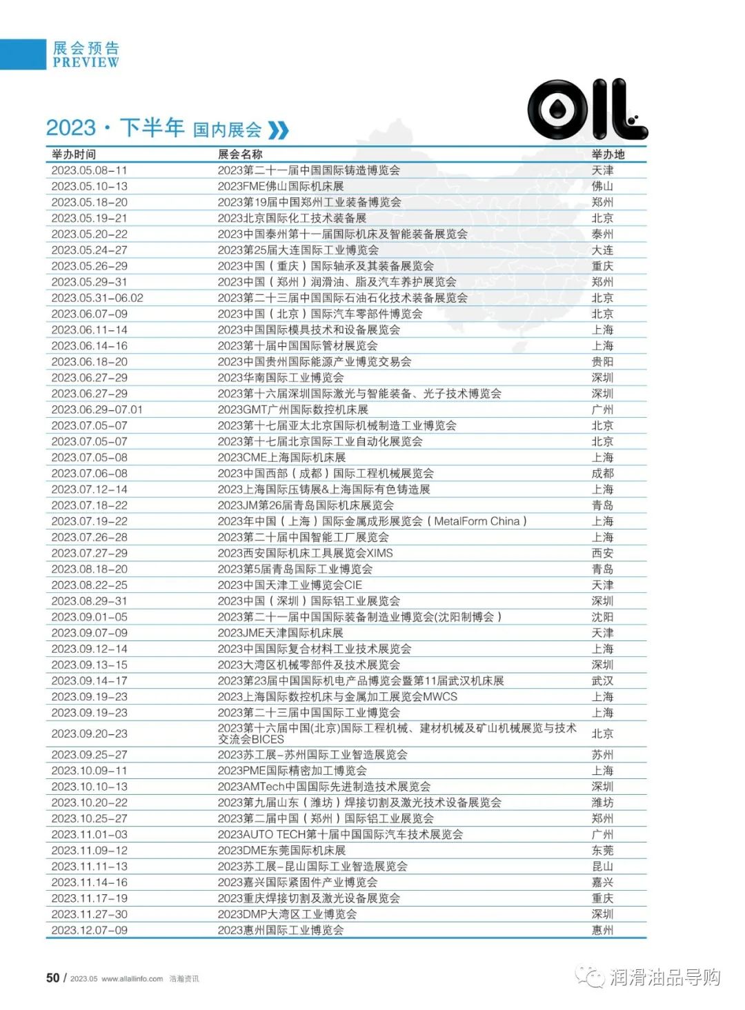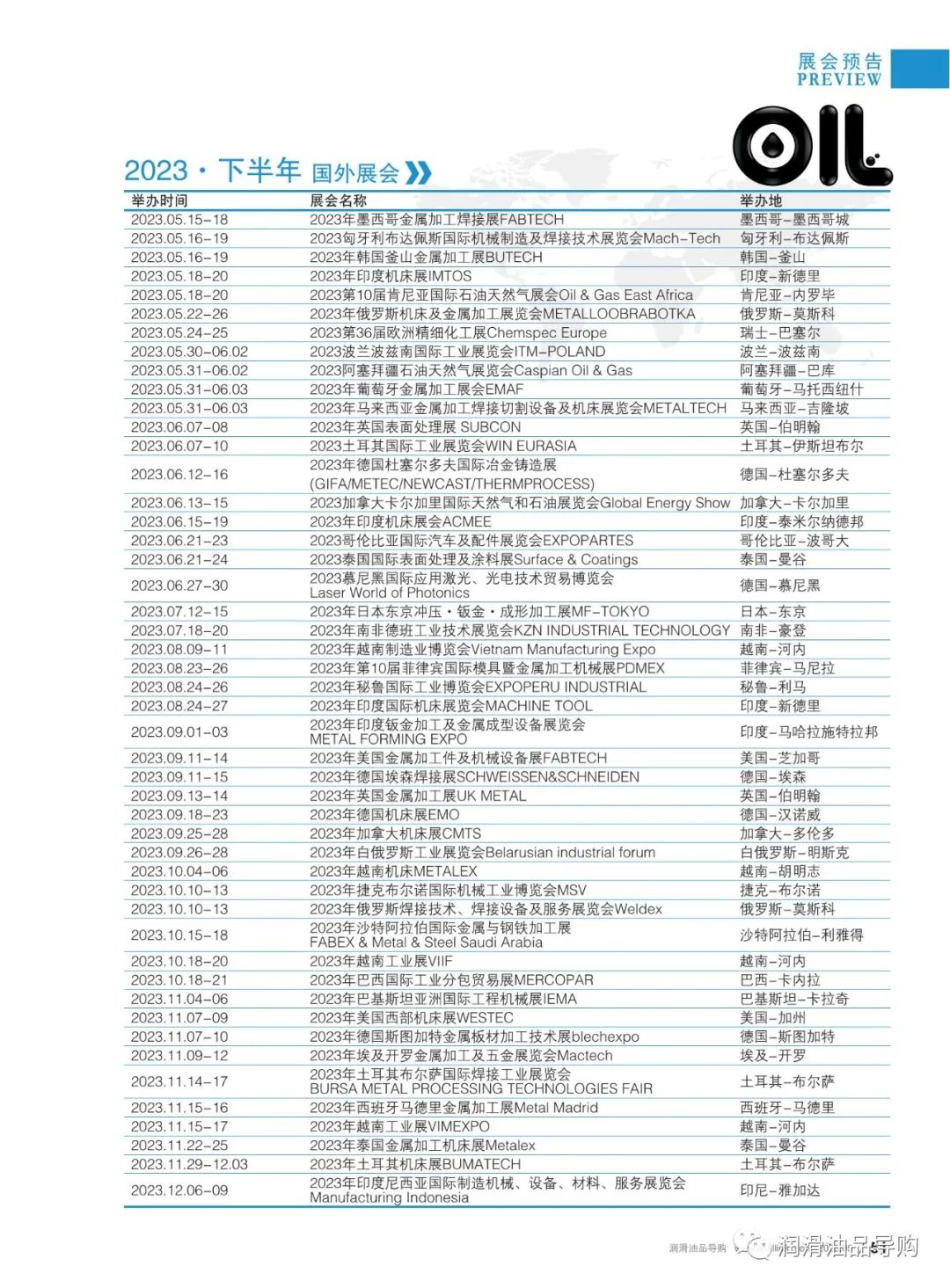 不知不觉已经到了2023年中了,六七月正是各大展会热火朝天举办的时期,小编已经将2023年下半年国内、国外润滑油相关的展会信息收集好,制成一览表,供大家参考!