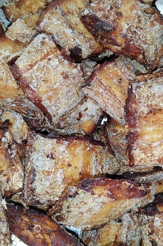4、锅内放油烧至七成热时,将挂好糊的带鱼一块一块的放入油中炸至金黄捞出,洒上少许椒盐面即可。