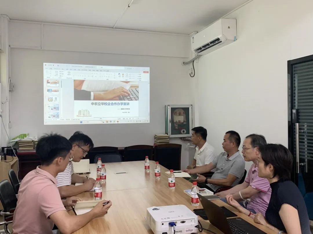 2023年5月31日下午,子衿书院同中农立华生物科技股份有限公司开展校企合作洽谈会,出席本次洽谈会的有书院党委书记李海朋、中农立华生物科技股份有限公司作物健康事业部总经理刘顺才、立华学院常务副院长李玮、华南大区经理石根辉、海南省经理陈垂雄、辅导员李健和谢淑婷。