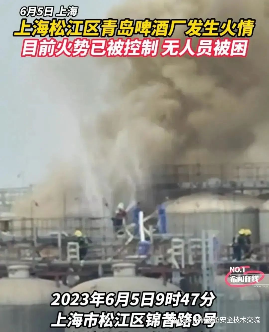 2023年6月5日9时47分,位于上海市松江区锦昔路9号的青岛啤酒厂发生火灾,浓烟滚滚,黄色浓烟升空。从网传视频看,现场浓烟滚滚,渐成黄色浓烟升空,消防人员站在罐体上进行救援。通常来讲,黄绿色烟是有毒的,有化学物质燃烧产生,需要认真对待。青岛啤酒回应,上海松江厂区发生火灾“正在核实。”