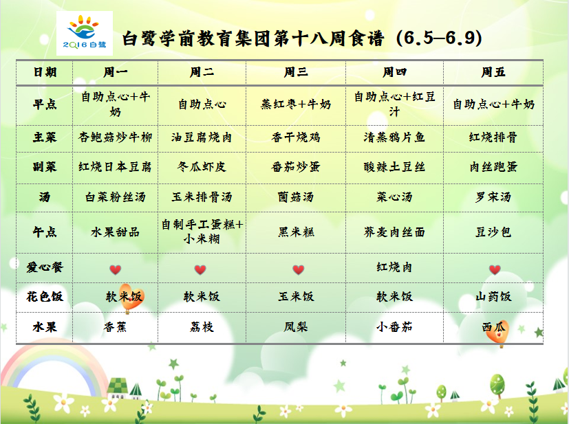 【白鹭·保健】美好“食”光|白鹭学前教育集团第十八周食谱6.5-6.9