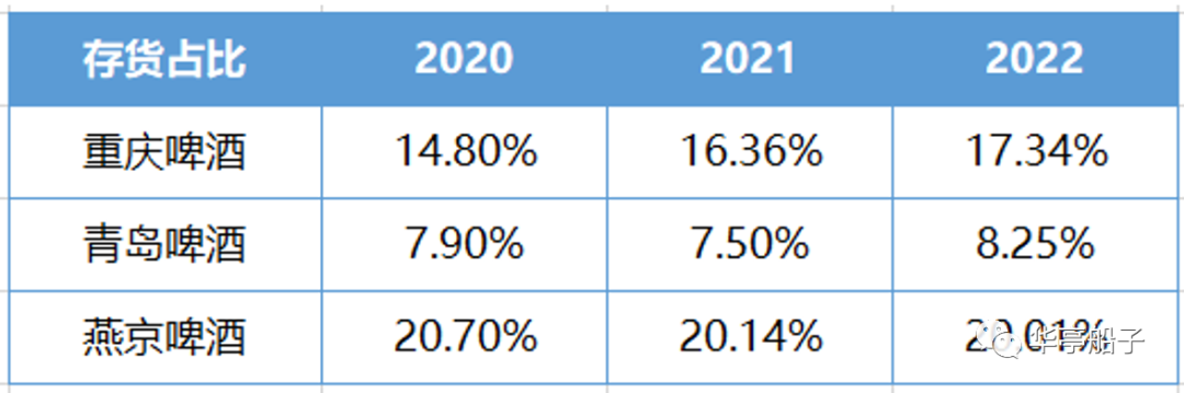近两年公司的存货占比保持在15%以上,低于燕京啤酒的20%,但高于青岛啤酒的8%.