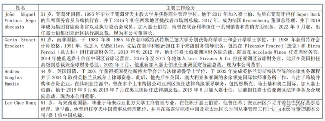 公司的现任董事长为João Abecasis,葡萄牙国籍,João Abecasis1995年毕业于葡萄牙天主教大学,获得商业管理学位,于2011年加入嘉士伯,曾经在联合利华担任一系列销售和营销方面职务,具备丰富的营销经验。