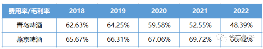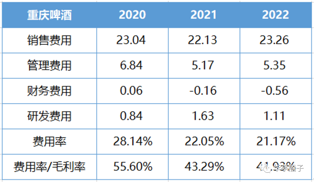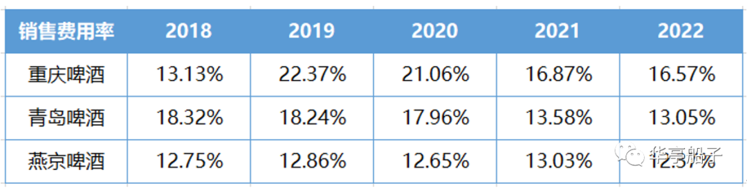 自2019年以来,重庆啤酒的销售费用率逐年下降,从2019年的22. 37%下降至2022年的16. 57%.而横向对比来看,2022年,青岛啤酒和燕京啤酒的销售费用率分别为13. 05%、12. 37%,都低于重庆啤酒。