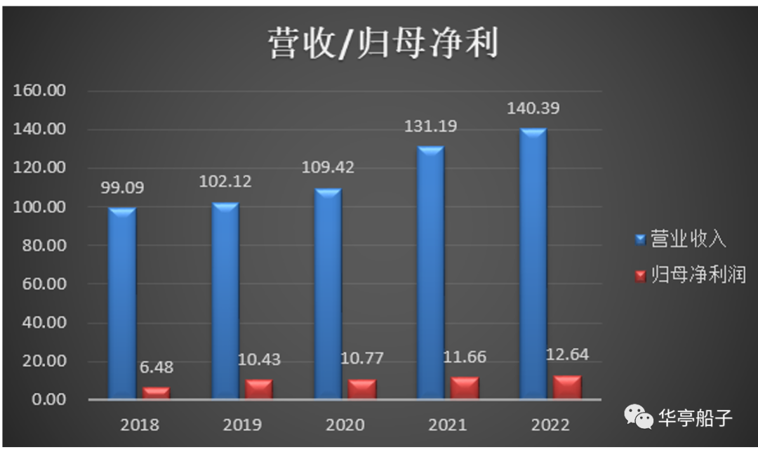 近五年来,公司业绩实现稳步增长。营业收入从2018年的99. 09亿元增长至2022年的140. 39亿元,年化复合增长率为9. 10%;归母净利润从2018年的6. 48亿元增长至2022年的12. 64亿元,年化复合增长率达到18. 18%,高于营收增速。