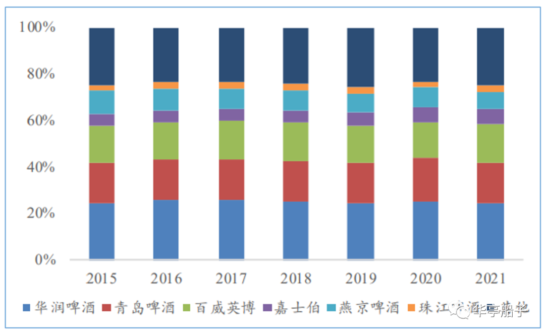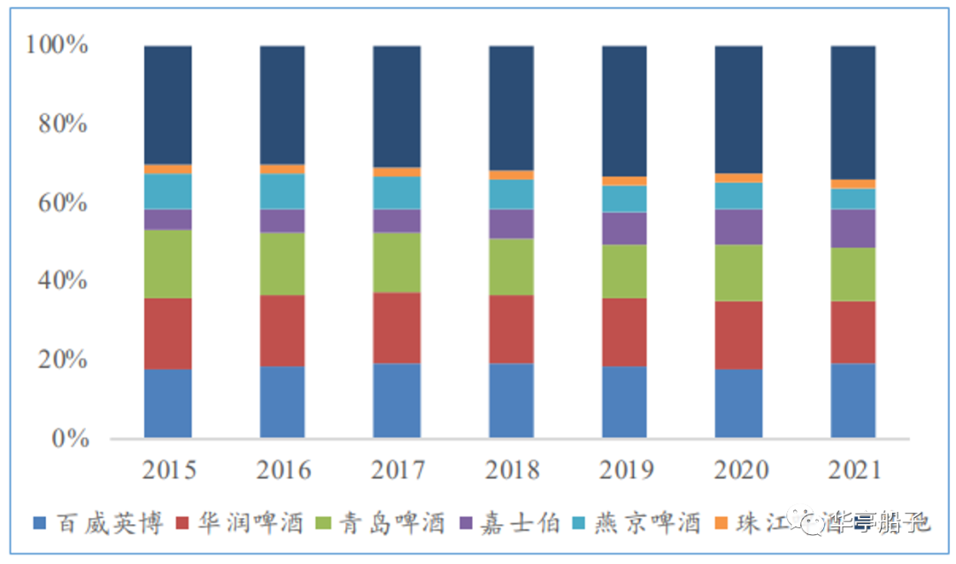随着行业竞争加剧,我国啤酒行业的市场份额不断向头部企业集中,国内五大啤酒龙头(百威英博、华润啤酒、青岛啤酒、嘉士伯和燕京啤酒)的市场份额总计超过90%,逐渐形成五大寡头垄断的市场格局。