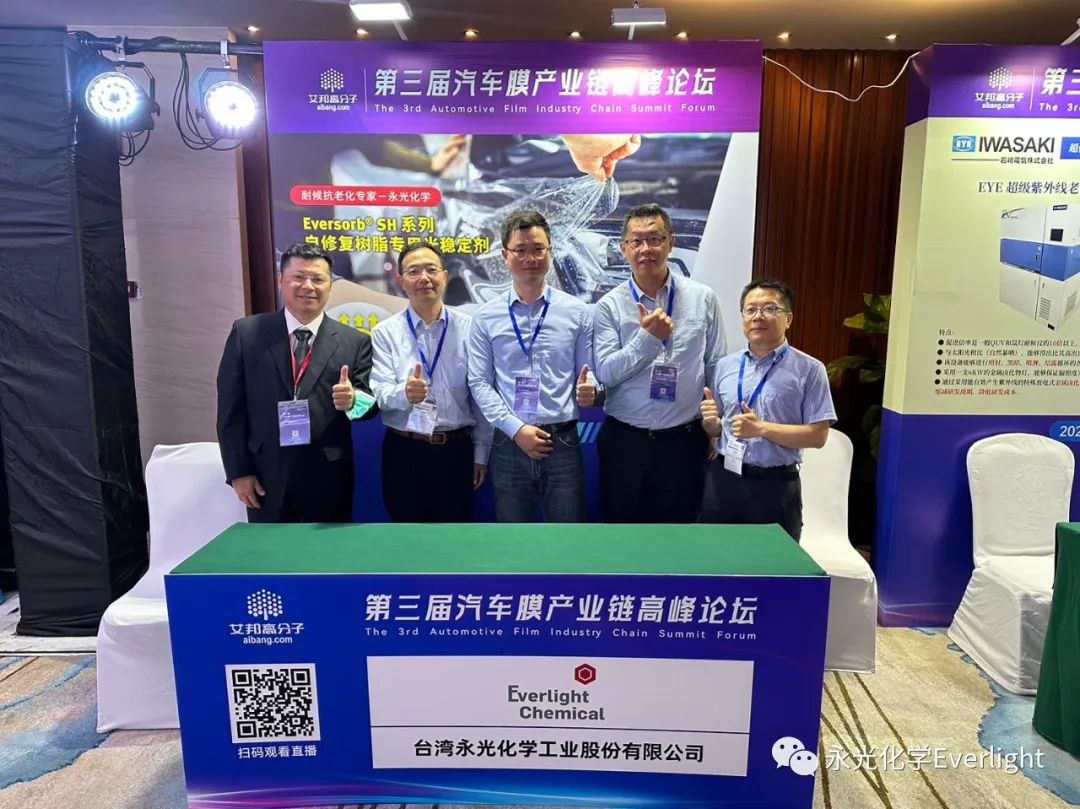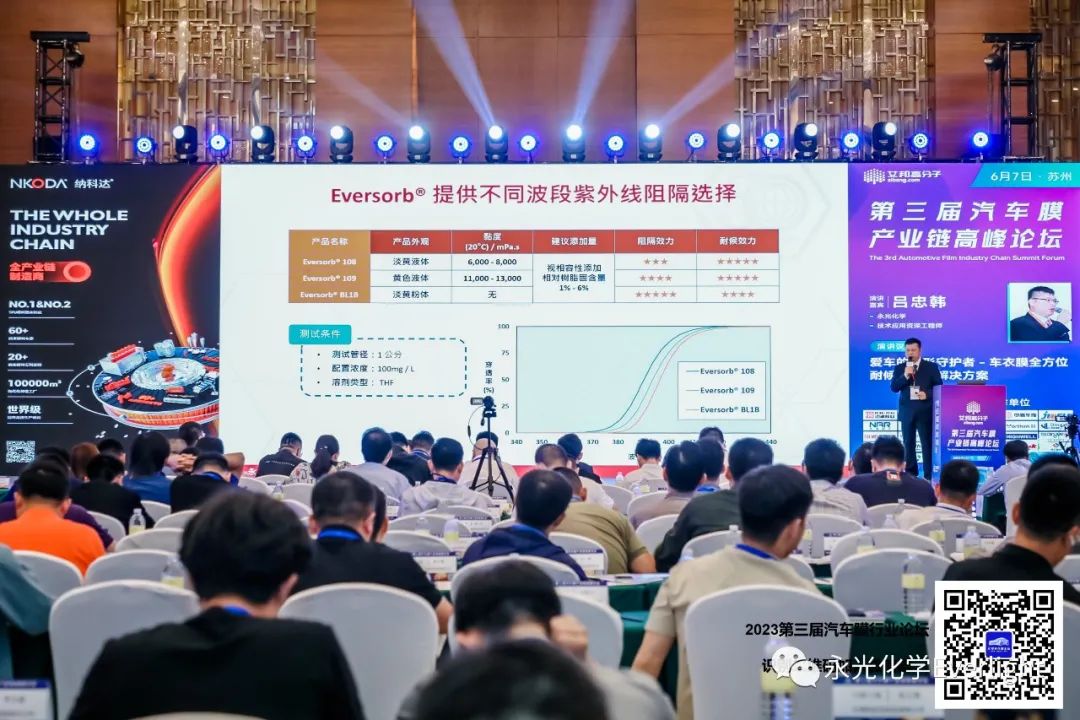 永光化学于6月7日参加艾邦高分子在苏州举办的第三届汽车膜行业高峰论坛,由特化技术处吕忠韩资深工程师发表《爱车的隐形守护者车衣膜全方位耐候抗老化解决方案》演讲,详细介绍了永光化学针对最新一代车衣膜的各层结构材料,如自修复涂层、TPU或 PVC 膜材、或PSA胶层,永光化学所设计各式专用光稳定剂产品,可全方位提升膜材耐候及耐热性能;其中为自修复树脂所特别设计之 Eversorb® SH,不仅能强化树脂本身耐候效能,更能显着缩短自修复所需的时间,使车衣膜产品整体延长使用寿命、提升竞争优势,获得现场观众广大好评及回响!