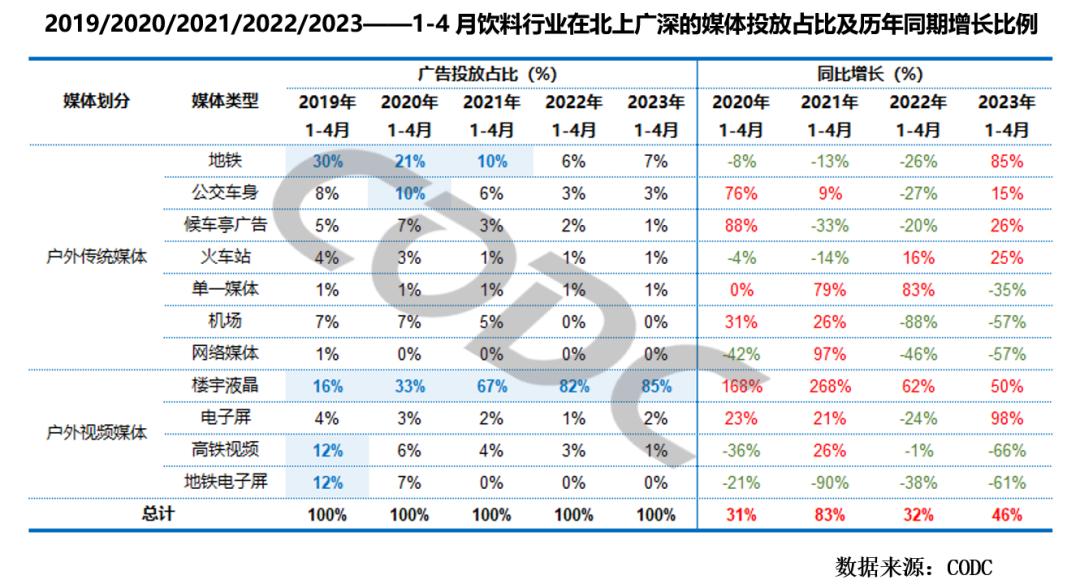 近几年分众楼宇液晶媒体越发受到广告主的青睐和认可,饮料行业在楼宇液晶媒体的广告占比逐年递增,已从2019年1-4月的16%上升至2023年1-4月的85%,广告集中度很高,而在电子屏、高铁视频、地铁电子屏媒体的广告投放不佳,广告占比不断缩小。