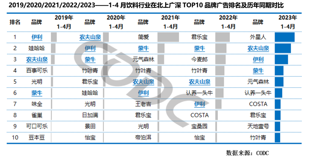 从近几年(1-4月)饮料行业的品牌排名看,头部品牌农夫山泉、伊利、蒙牛是行业投放的佼佼者,连续五年登上前十榜,今年1-4月三大品牌的广告投放依然强劲,排名前四。
