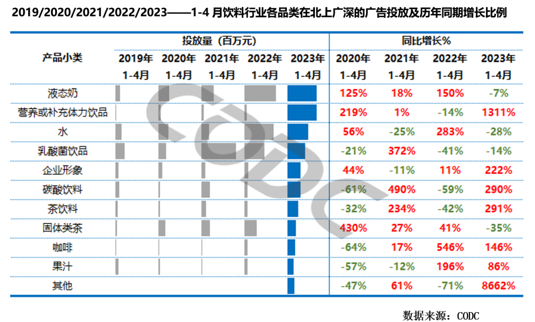 从近几年1-4月饮料行业细化的品类看,多个品类在户外的广告投放强势,即使是疫情三年,仍有多个品类的广告呈现增长。2020年1-4月,液态奶、营养或补充体力饮品、固体类茶等健康饮品的广告投放火爆,同比增幅翻倍。2021年疫情进入常态化管理,饮料行业在乳酸菌饮品、碳酸饮料、茶饮料等品类广告的猛增下呈现强势反弹;2022年1-4月液态奶、水、咖啡、果汁等饮品广告快速升温,带动饮料行业广告持续增长,今年1-4月随着经济的复苏,消费市场的回暖,饮料行业的广告增幅同比加快,营养或补充体力饮品、企业形象、碳酸饮料、茶饮料、咖啡、果汁等品类的广告投放同比增幅突出,为饮料行业的增长贡献了主要力量。