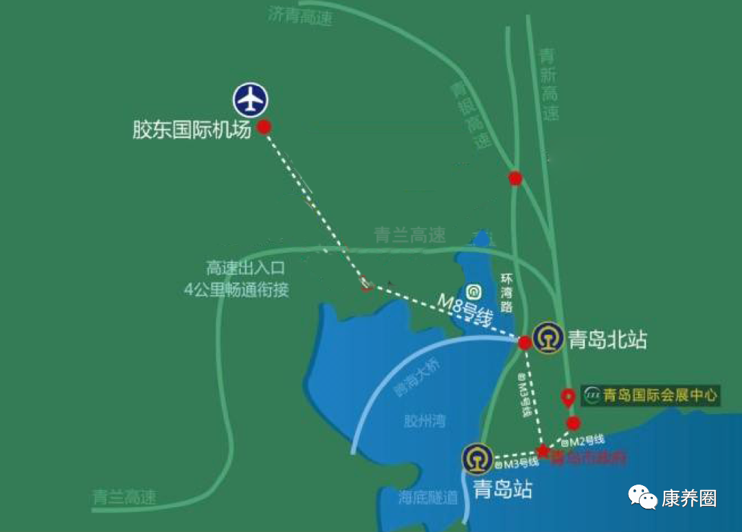 ◆由青岛胶东国际机场可乘坐地铁8号线-3号线-2号线-11号线,在青岛国际会展中心站下车即到。
