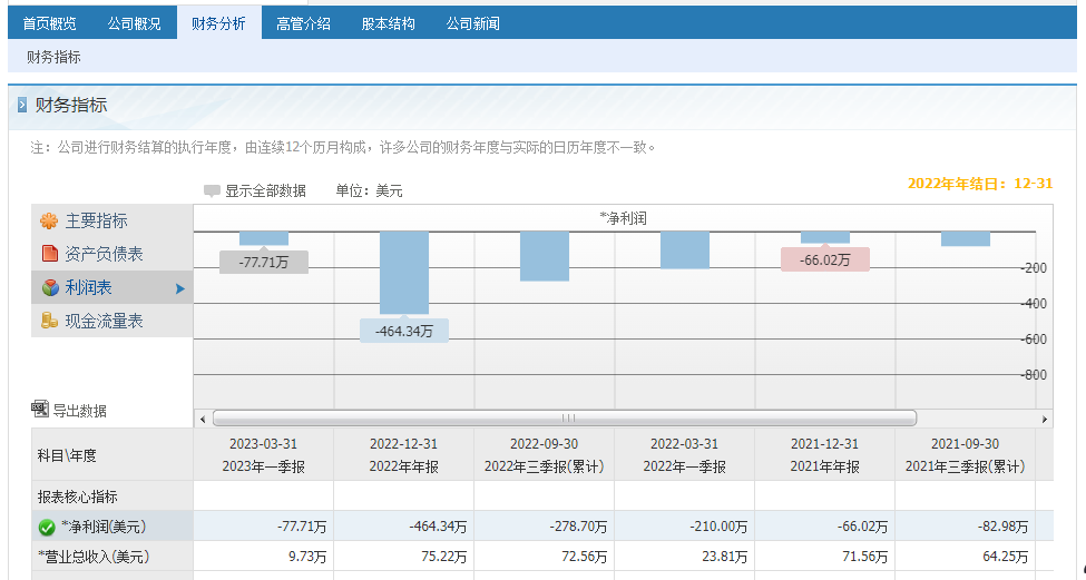 招股书显示,在过去的2021年、2022年,该公司的营收分别为71.56万美元、75.22万美元,这期间相应的净利润分别为-66.02万美元、-464.34万美元。