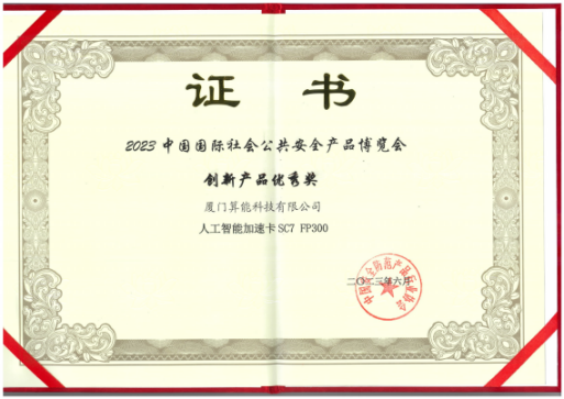 算能新一代人工智能加速卡SC7 FP300在安博会评选中荣获创新产品优秀奖。