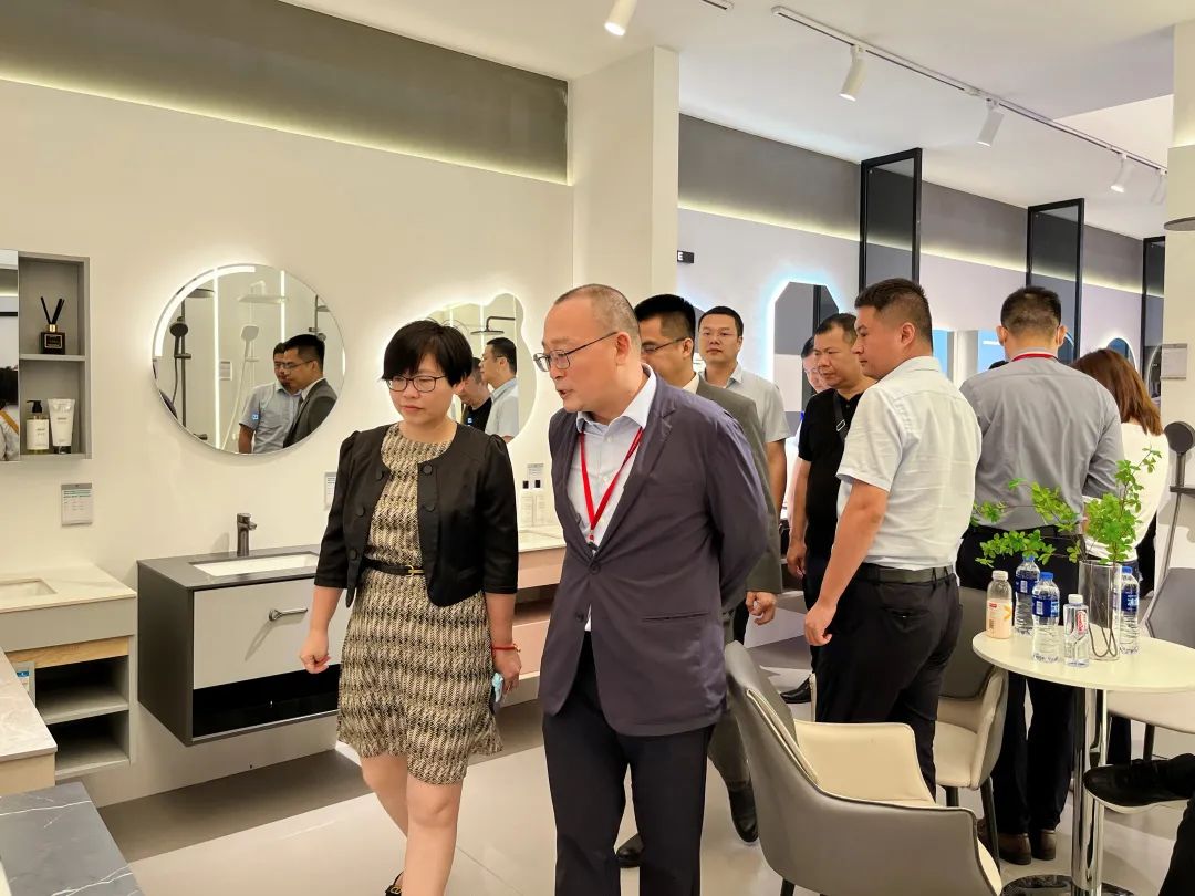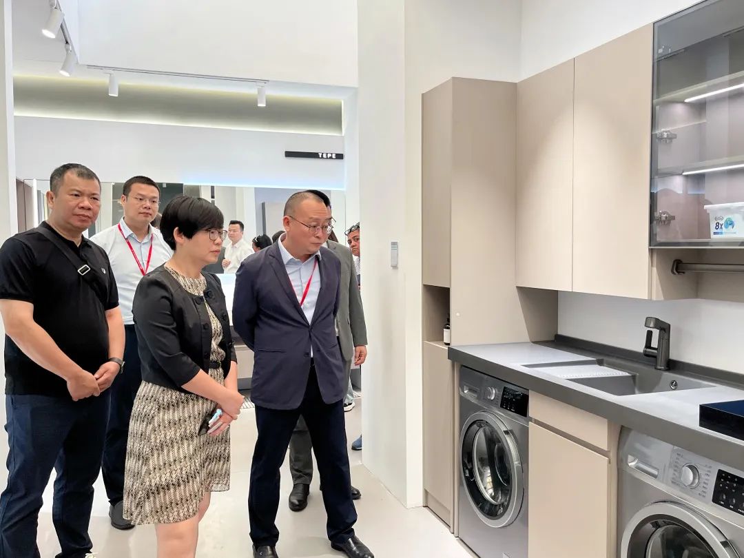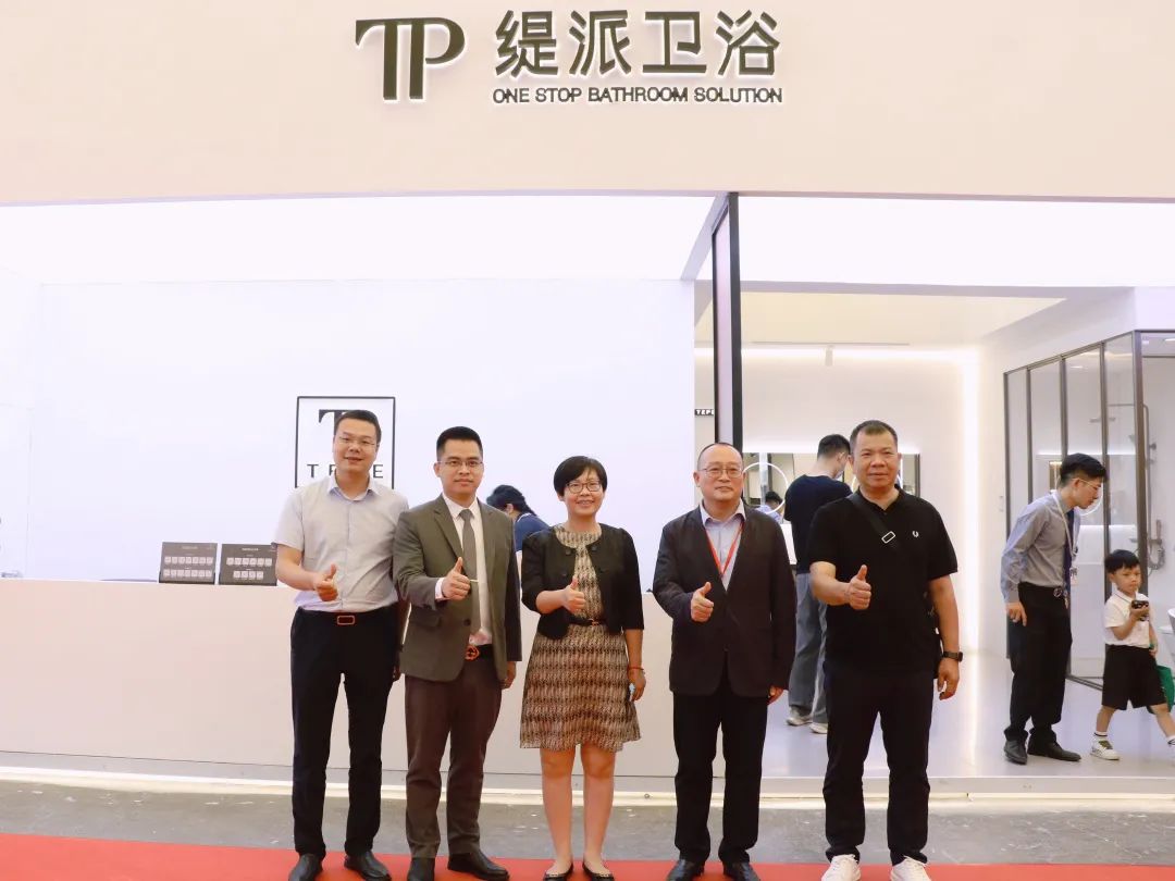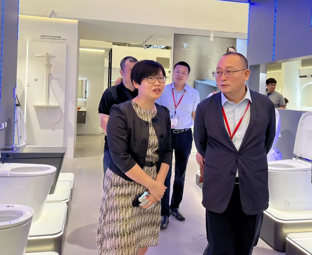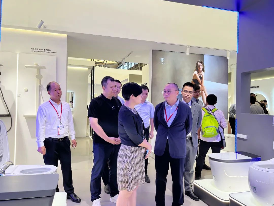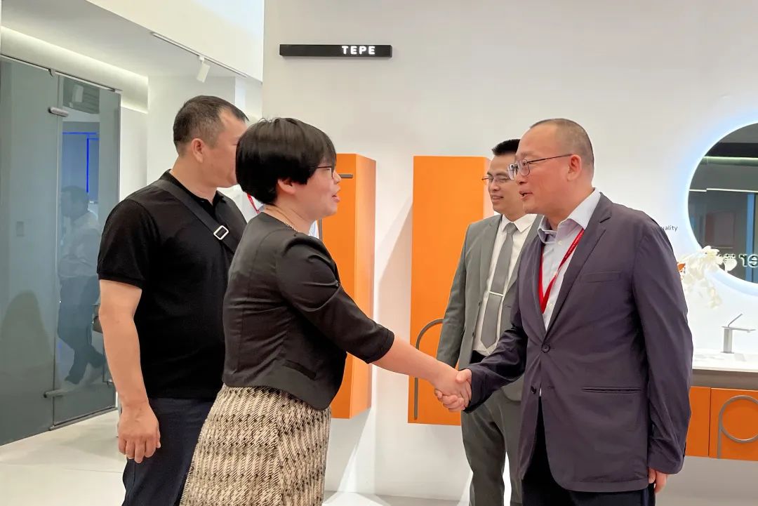 6月8日,广东省开平市市委副书记、市长陈小曼,广东省开平市水口镇党委副书记、镇长胡万程一行莅临2023上海厨卫展TEPE缇派展馆E4E26参观指导。一二三科技集团董事长张勇先生、集团副总裁班显宾先生、集团副总裁兼缇派卫浴事业部总经理温尊华先生等公司领导热情接待。