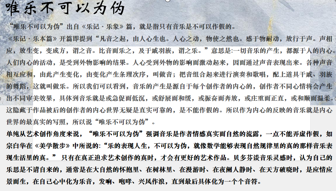 “唯乐不可以为伪”,这句话本身存在着丰富的教育思想,这与儒家的传统理念不同。这一点颠覆性的观点被接纳后便提出了以乐净化人心使其到达内心平静,与此同时也提了对“乐”与“伪”的要求,即用真诚的心去制“乐”,绝对不能掺半点虚假。