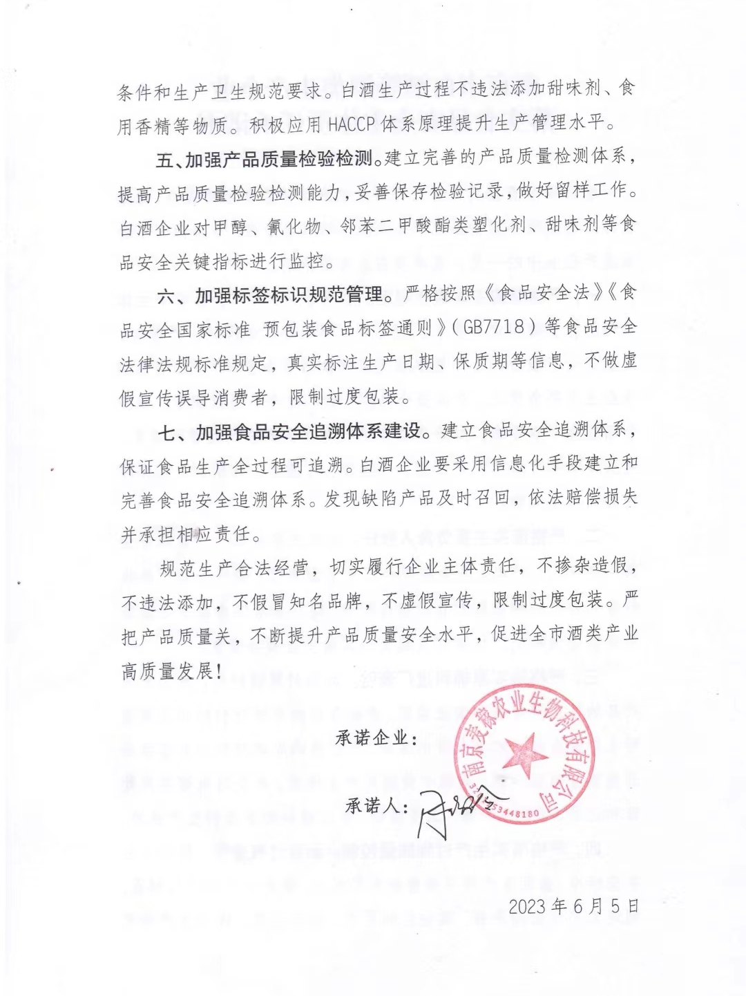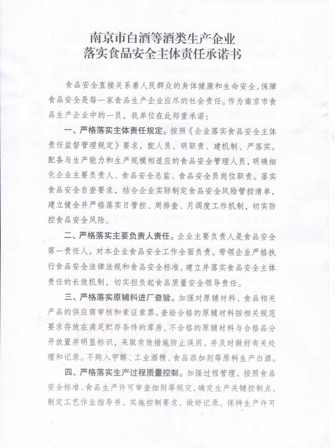 现场开展企业主体责任承诺活动,酒类生产企业主要负责人签署了《南京市白酒等酒类生产企业落实食品安全主体责任承诺书》,承诺规范生产合法经营,切实履行企业主体责任,不掺杂造假、不违法添加、限制过度包装等。