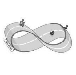“莫比乌斯带”是一种拓扑图形,正好可以两点不重合,但能从里走到外,或从外走到内。这是在公元1858年,由德国数学家莫比乌斯(Mobius,1790-1868)和约翰·李斯丁发现的:把一根纸条扭转180°后,两头再粘接起来做成的纸带圈,具有魔术般的性质。