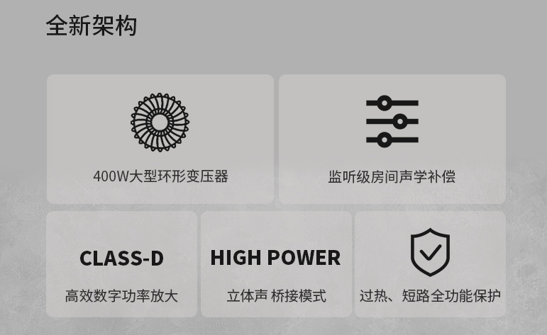4、双路电子分音设计。大功率低音功放提供澎湃低频和极强的控制力,即使是欣赏大编制古典音乐和大动态电影都能胜任。低失真、小功率功放驱动高音,双路功放各司其职互不影响。