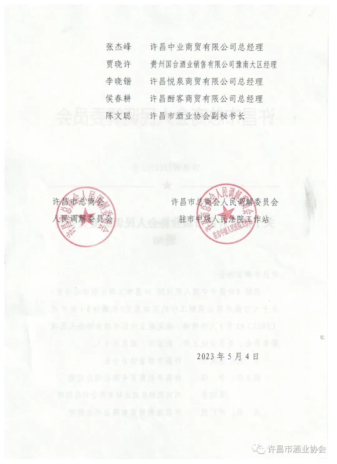 2023年5月,在许昌市中级人民法院的指导下,许昌市酒业协会成立了人民调解委员会。