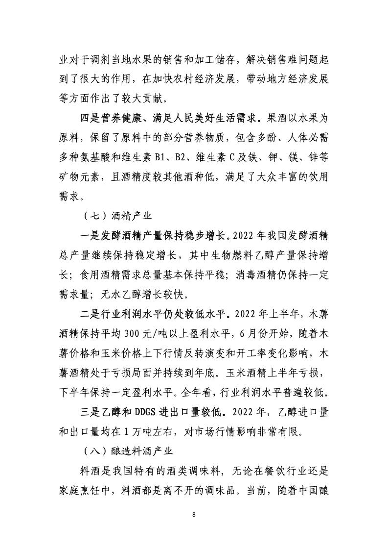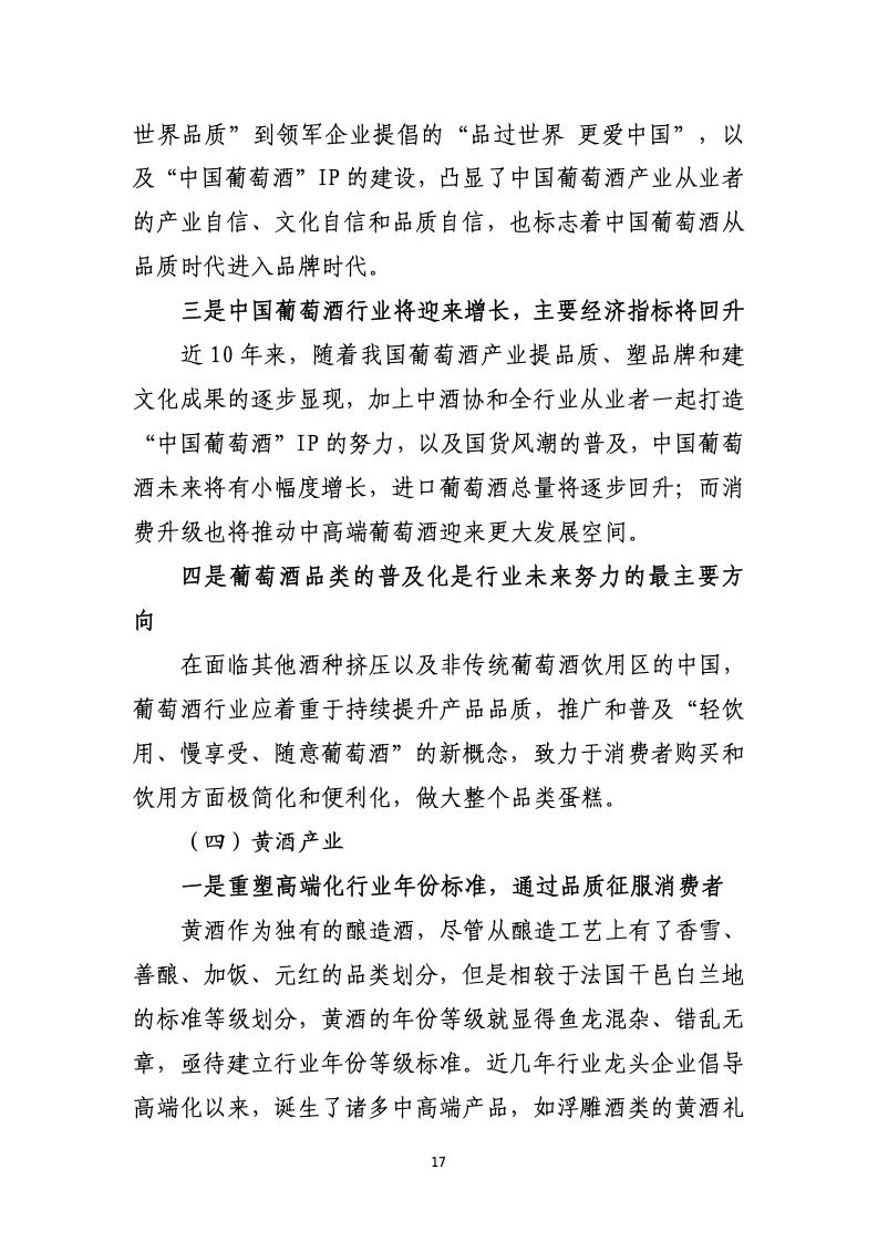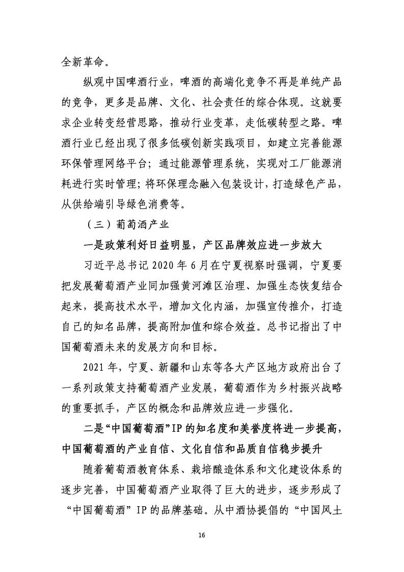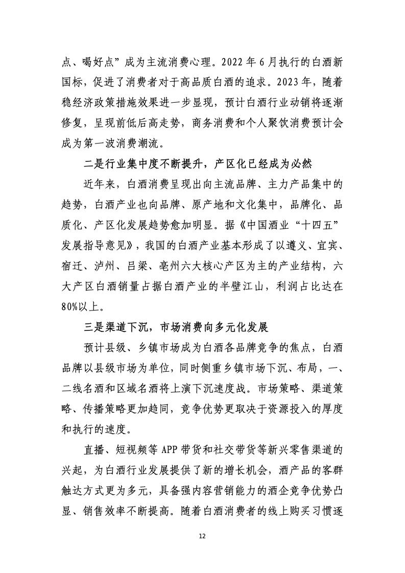 产业发展和市场运行呈现出以下主要特点:名酒价值凸 显,推动高端市场扩容;产业政策利好,护航高质量发展; 高举文化自信,树立酒业价值体系;三方联动主导,产区建 设渐成趋势;扩充优质产能,引领智能化与生态酿造;坚守 品质至上,讲好中国酒业故事;资本跨界饮酒,助推行业转 型升级;双碳战略落地,酒业植入绿色内核;加大人才培养, 缓解行业人才赤字;加强国际推广,“走出去”进程提速; 不断创新求变,满足新消费新需求。