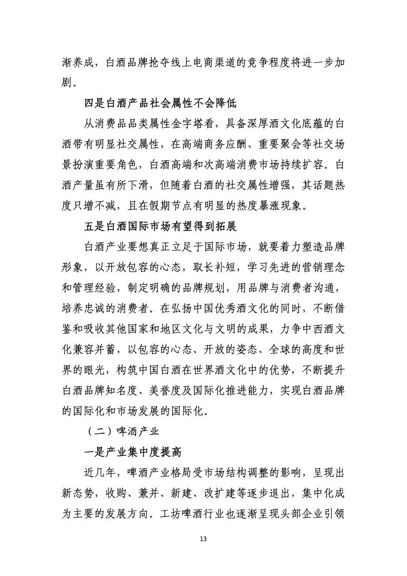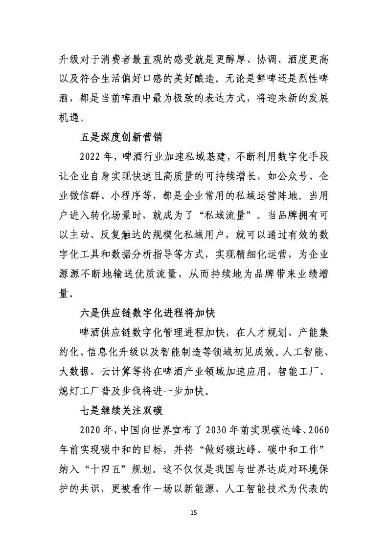 特别是部分小啤酒生产企业,在没有深厚的资金背景支持下 被淘汰。产品是否成功,与专业技术、与酿造理念有时并不 能成正比;能否抓住消费者的消费好奇心,满足个性化需求, 掌握最全面的渠道份额以及精准的营销策略才是最为重要 的从业门槛。因此,以主流啤酒为基础的特色化和差异化产 品升级和头部企业的多元化品牌发展仍将是行业未来发展 的主要基调。