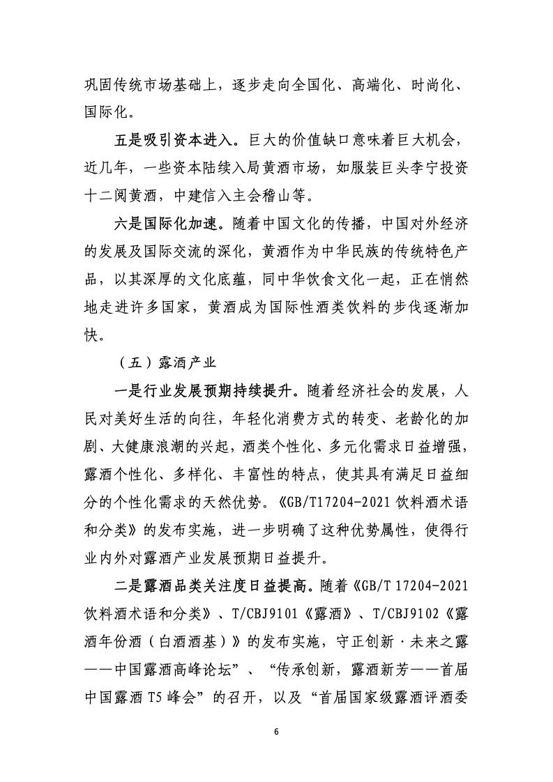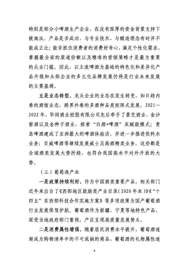 五是业态转型。龙头企业的业态在发生转变,如日趋内 卷的酒馆业态,跨界外卷的多酒种品类矩阵式发展。2021— 2022 年,华润酒业控股有限公司先后牵手了景芝酒业、金沙 窖酒以及金种子酒业,探索“白酒+啤酒”双赋能模式;青 岛啤酒建成了亚洲最大的啤酒体验店,并进一步推进饮料水 业务;百威啤酒等继续发展威士忌高酒精类业务。这些都是 全球酒类发展大势所趋,也符合我国高水平对外开放的大 势。
