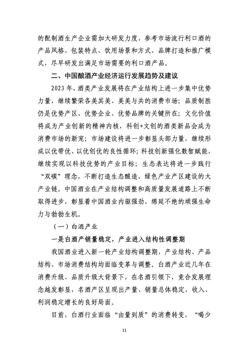 从经济指标看,白酒产业保持了较高的效益增长。纵观全年,头部名酒企业基本保持两位数增长,是白酒产业经济增长的主要动力。优势资源和品牌资源向优质产区和名酒企业聚集的趋势愈发明显,中小酒企面临的压力持续加大,区域酒企有机会,更有挑战。从产能看,“十三五”时期的白酒产量高峰 1358 万千升,到今天的 671 万千升,白酒总产量不断下降,说明产业 存在产能过剩压力,加之横向竞争、健康消费观念带动的消 费结构变化,白酒产能未来仍有下降空间。盘活优质产能、 淘汰低效产能,成为白酒产业可持续发展的关键之一。