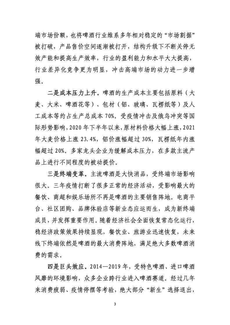 巨头效应。2014—2019 年,受特色啤酒、进口啤酒 风靡的环境影响,众多企业跨行业进入啤酒赛道。经过几年 来消费疲弱、疫情停摆等考验,绝大部分“新生”选择退出,
