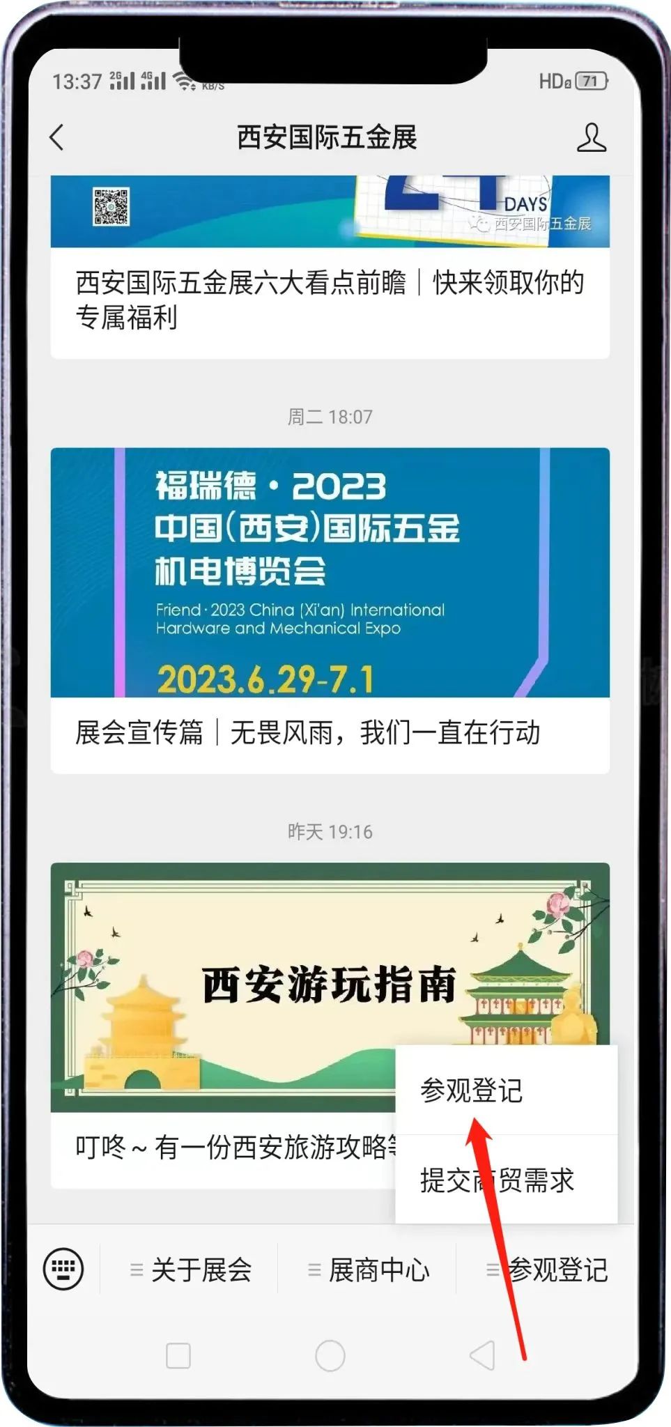 搜索西安国际五金展公众号点击关注,进入西安国际五金展公众号菜单栏{参观登记}输入手机号、验证码,确认即可成功预登记!