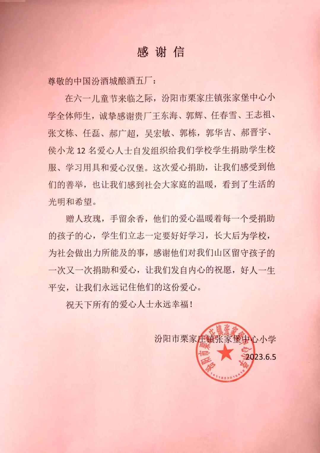 近日,酿酒五厂收到了一封来自于汾阳市栗家庄镇张家堡中心小学的感谢信,信中张家堡中心小学全体师生对酿酒五厂12名爱心职工的捐助与善举表示由衷的感谢,并送上了美好的祝愿。