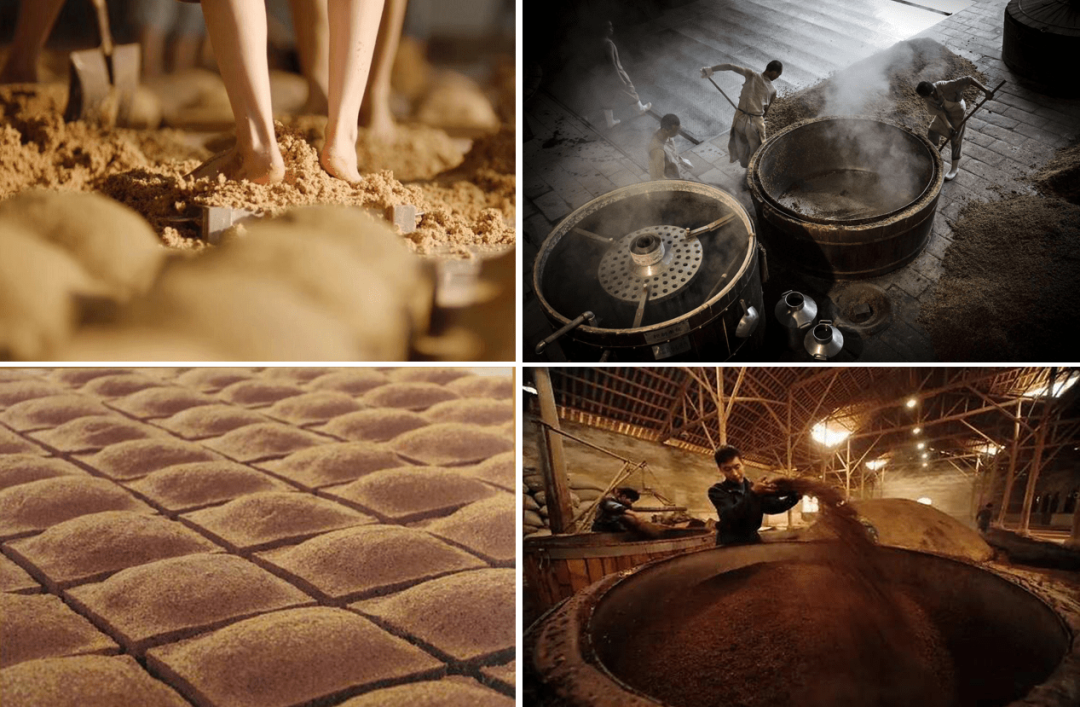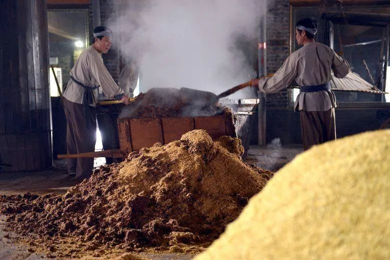制曲时间在夏天,制曲车间里的温度经常高达40摄氏度。高温有利于微生物的生长,这些微生物混入曲块中分泌出大量的酶,可以加速淀粉、蛋白质等转化为糖分。