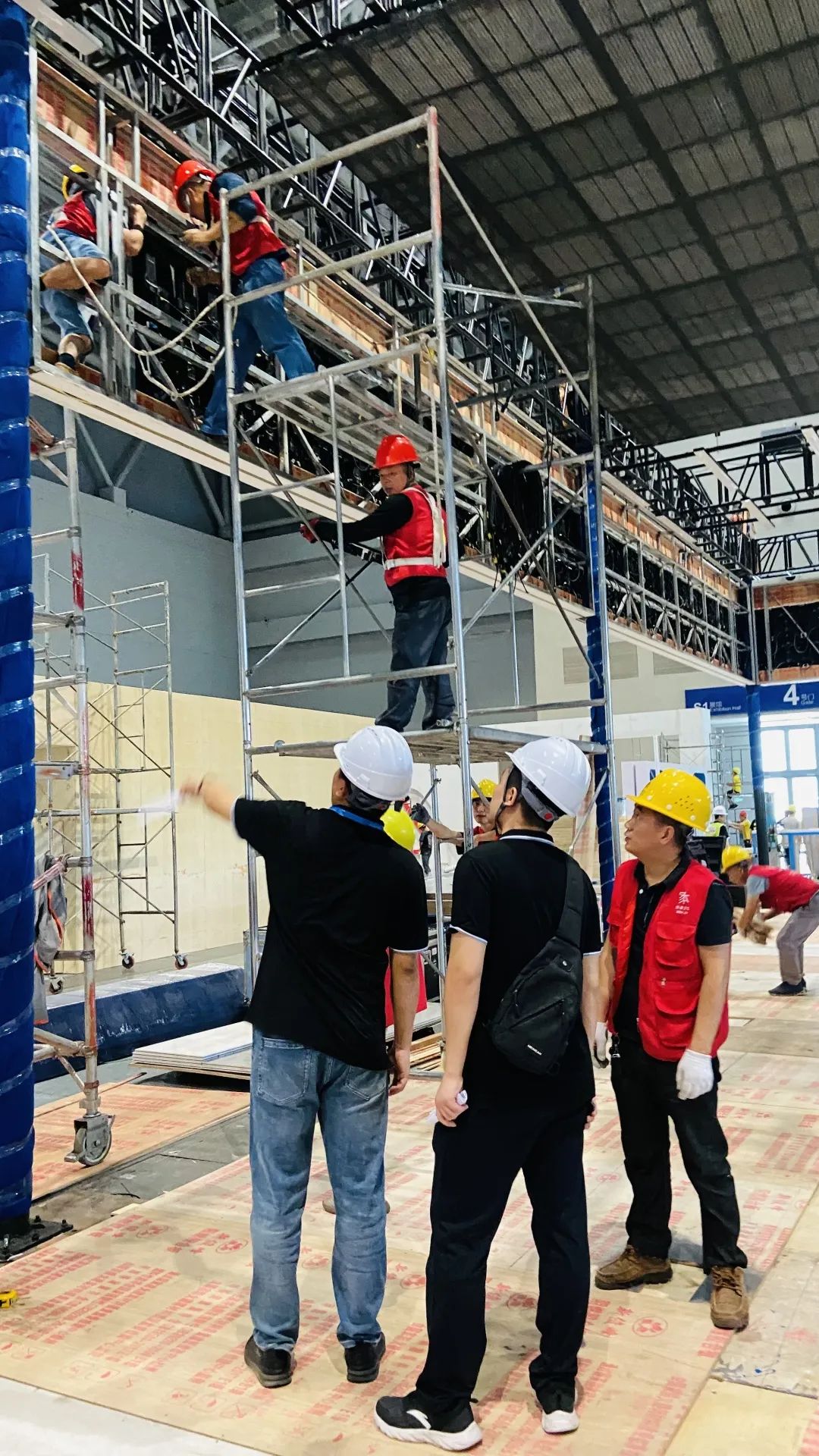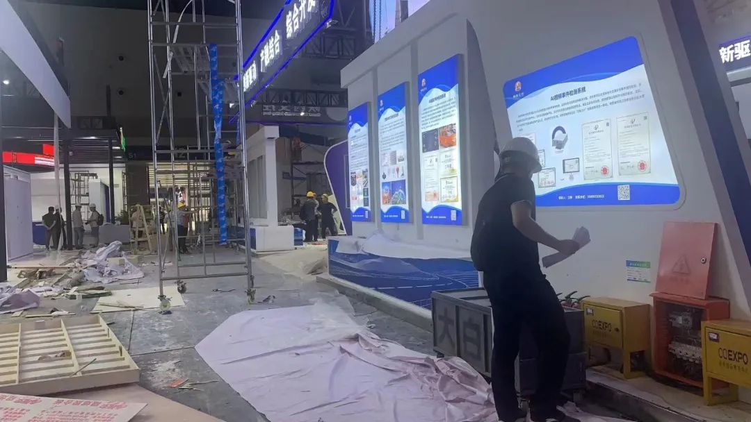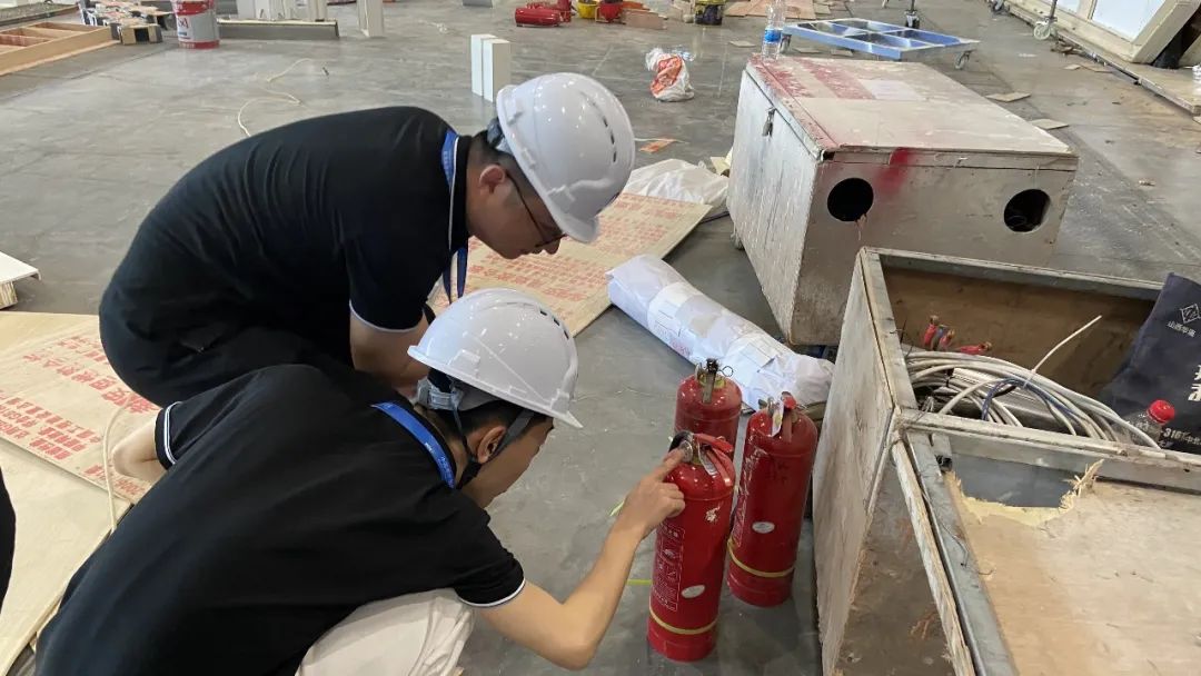 同时,还会在每个所负责的场馆配备两名专业安全巡查人员,不断巡回检查展位现场搭建情况,如吊顶是否被私自调动、现场搭建是否符合搭建图纸、搭建情况是否符合进度等,最大程度助力现场安全施工。