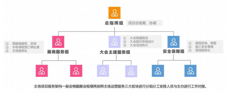 根据收集整理出的精准数据,制定了科学、缜密的参展商搭建图纸审核流程和标准、参展设备进场表、各展位水电气接驳路线图、搭建进度表以及等前期的统筹规划工作。同时提前做好项目服务团队分工。