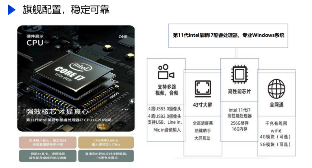 号越A5直播一体机搭载了第11代Intel i7酷睿处理器,四线程八核心,稳定支持多路直播顺畅不卡顿;CPU频率2.8GHz,最大睿频至4.7GHz;锐炬Xe显卡,提供独显级性能以及卓越的响应速度,直播的同时能够轻松应对视频剪辑、PS等专业需求。