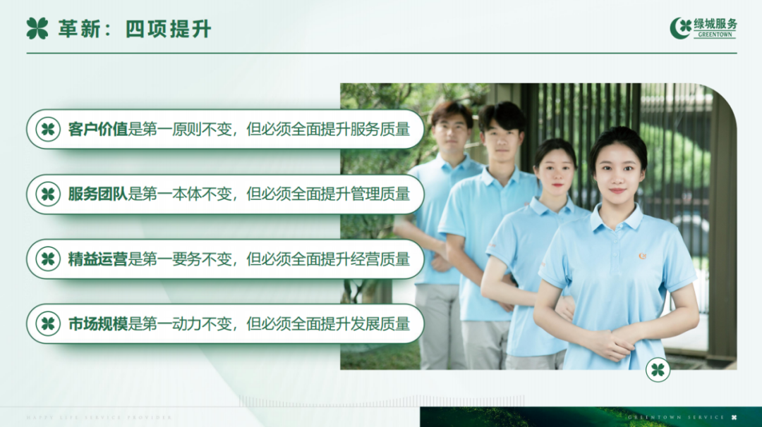 第二,品质领先。绿城服务一直以客户满意、员工成长两个主体作为企业文化的立足点,因此,我们拥有整体的战略定力,所以在行业高歌猛进时,我们还是坚持走市场化内生型扩展之路,走以品质为核心的服务道路。