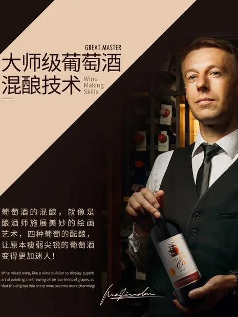 而另两张图,外国模特手中则是手持两款不知名葡萄酒,两款酒的酒标图案一样,都是帆船,但帆船的颜色一红一黑,图片上则写着“大师级葡萄酒混酿技术”,下方还有一行外文签名。当WBO尝试查找图片所在网址,却发现网址已停用。